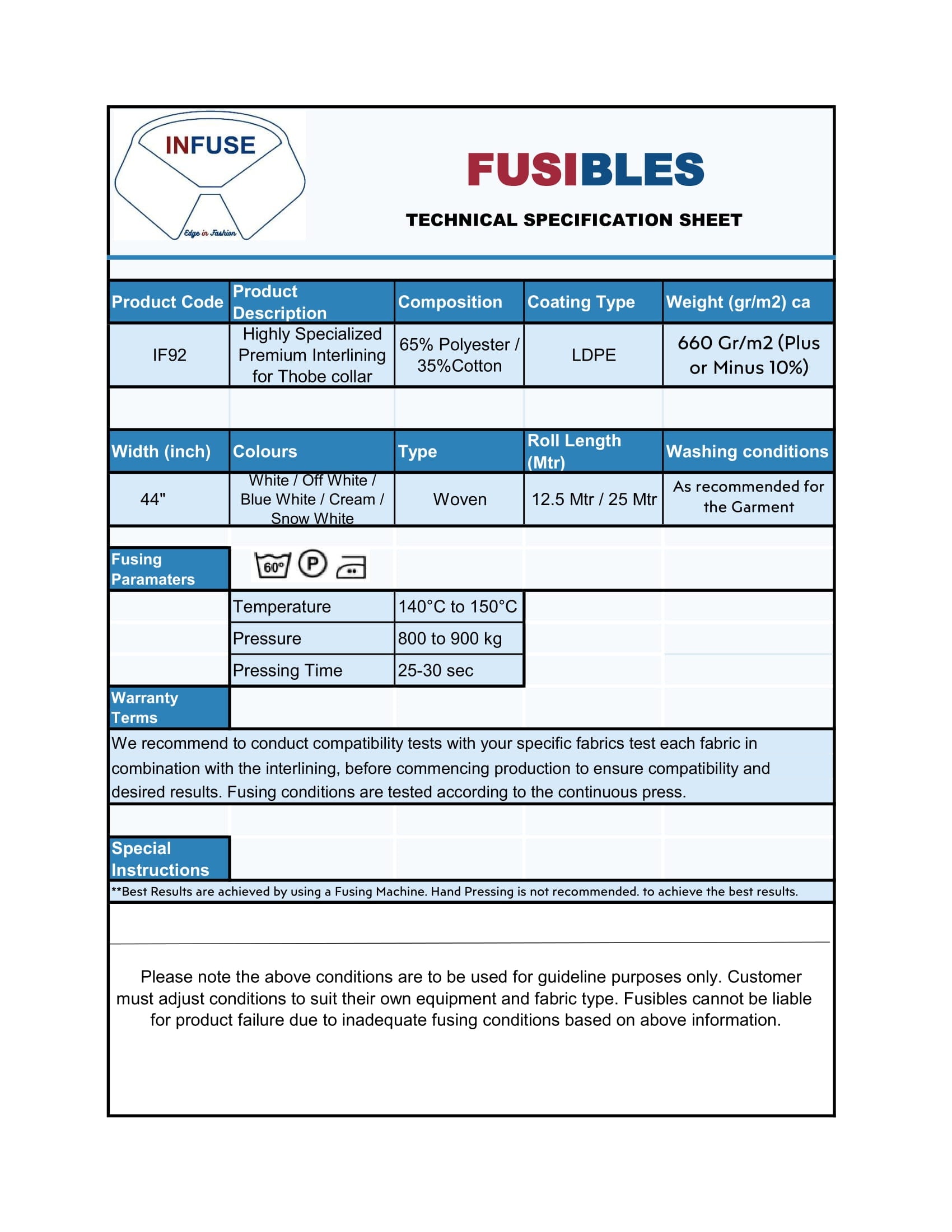 IF92 is a hard interlining fabric with a substantial weight of 500-550 GSM, specifically designed for thobe and shirts collars and cuffs. Its firm structure provides excellent support and shape retention, making it ideal for reinforcing high-stress areas in formal and tailored garments.