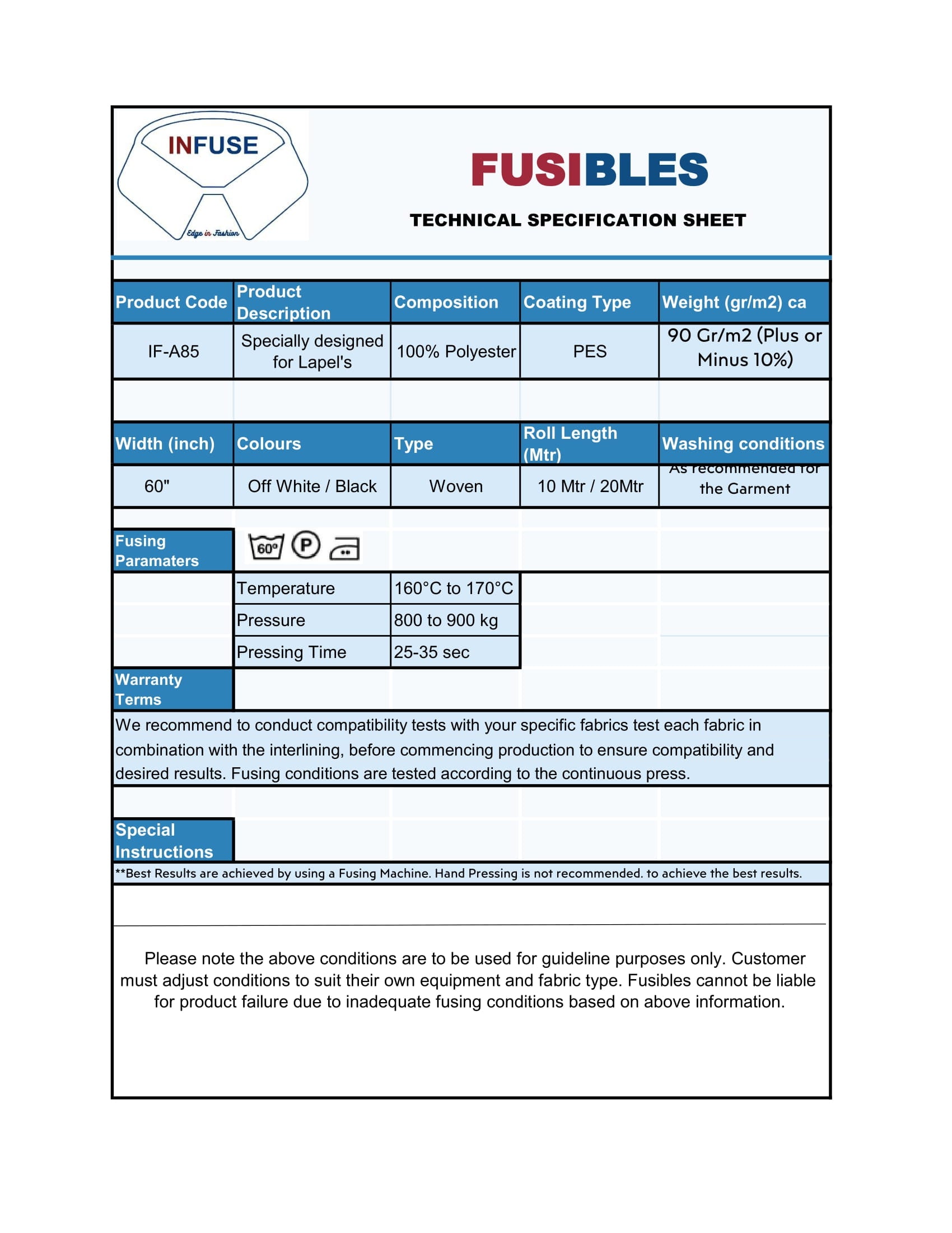 Smooth-finish interlining designed for front fusing in tailored jackets. With a weight range of 70-80 GSM and microdot adhesive structure, IFA85 ensures clean lapel shaping, soft hand feel, and consistent adhesion. Suitable for both poised suitings, normal jackets as well as leather jackets, it delivers reliable performance across diverse fabrics while maintaining a refined silhouette.